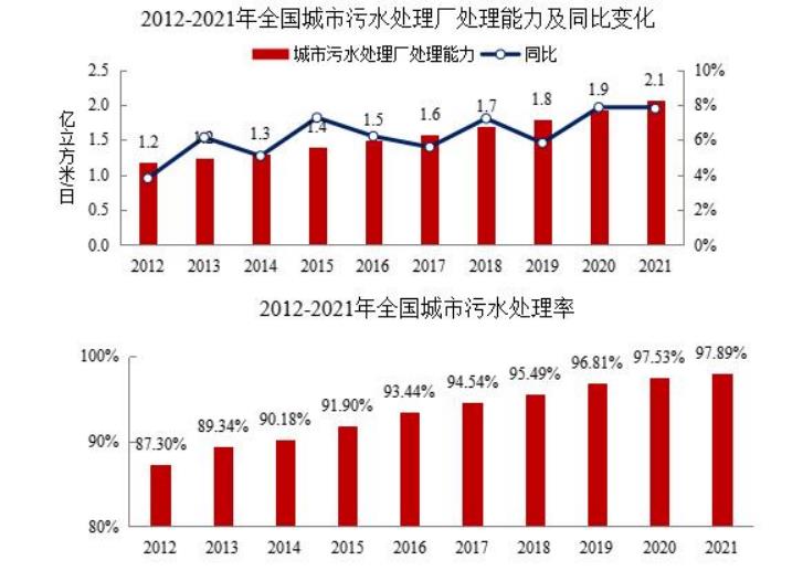 2021年年末,全国城市排水管道总长度87.2万公里,同比增长8.7%;污水处理厂处理能力2.1亿立方米/日,同比增长7.8%。