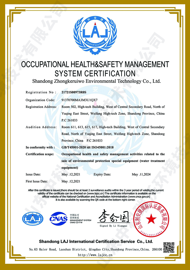 职业健康安全管理体系认证证书~中英文